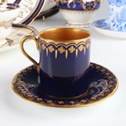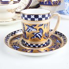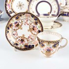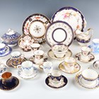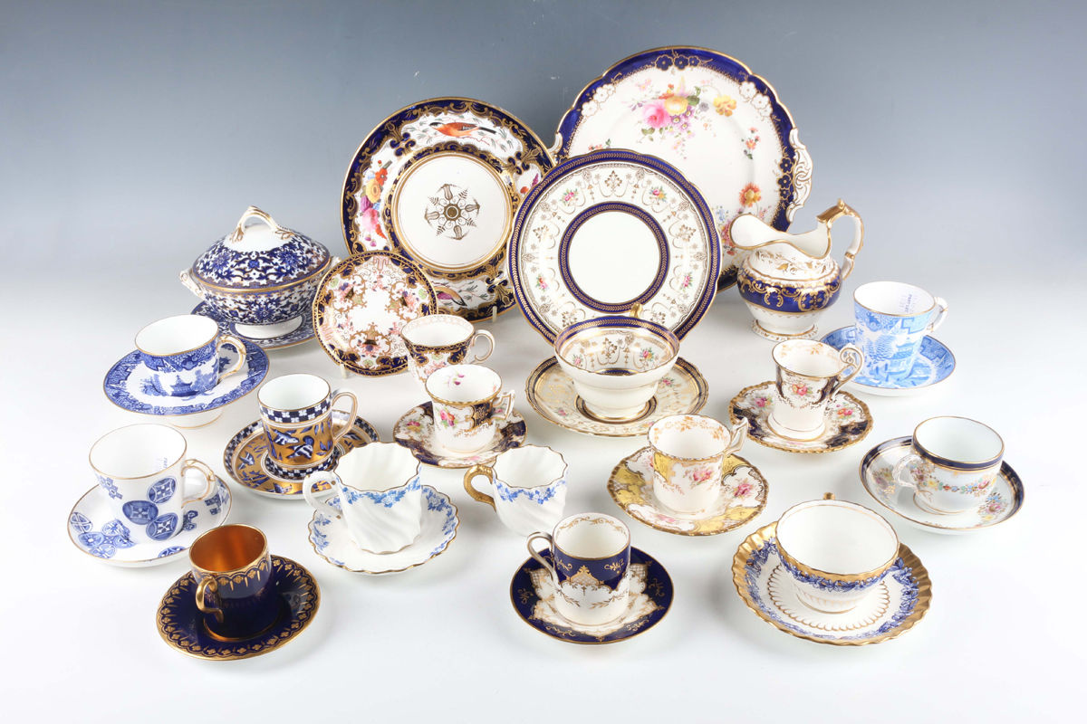 A collection of fourteen assorted coffee or tea cups and saucers, late 19th and 20th Century, British and Continental, including a Royal Crown Derby Japan pattern example, dated 1904, pattern No. 3788, diameter of saucer 10.7cm, a Meissen example painted and gilt with a band of flowers and foliage beneath a cobalt blue and gilt rim, diameter of saucer 11cm, one by Royal Worcester, dated 1880, with Japanese Mon type decoration in underglaze blue, a gilt lined can and saucer with cobalt blue ground, a Cauldon trio and a blue printed example with trembleuse saucer, together with a Royal Crown Derby cake plate decorated with floral groups, a Coalport tureen stand and three other pieces (faults).