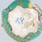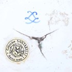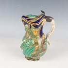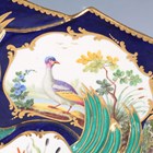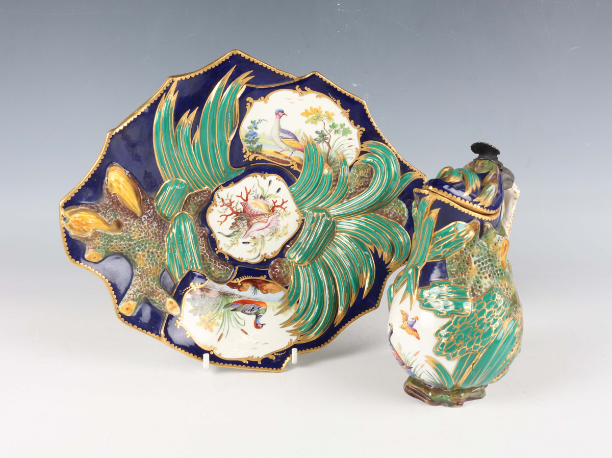 An unusual porcelain ewer and stand (Pot à l'eau à la Romaine), probably Sèvres, late 18th/early 19th century, both pieces moulded in high relief with naturalistically painted bulrush leaves and coral like branches against a cobalt blue ground, the ewer painted with a panel of birds and with white and gilt branch like handle, its hinged lid similarly moulded and with pewter mounted shell shaped thumbrest above the gilt dentil rim edges, the oval stand with overlapping detail beneath the shaped rim with gilt dentil edge, painted with two bird panels around a central panel of painted shells and coral, both pieces overall outlined with gilding, blue painted interlaced 'L's' mark to base of each piece, stand with collector's label inscribed 'Coleccion SANTARELLI Buenos Ayres', length of stand 23cm, height of ewer 14cm.