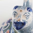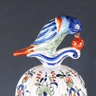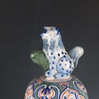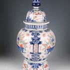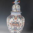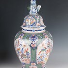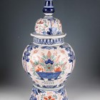 A Rouen faience vase and cover, 20th century, the lobed high shouldered body painted in 18th century style with baskets of flowers and pendant flowers and scrollwork, the domed cover with bird finial, painted marks to base, height 50cm, together with two 20th century Dutch Delft vases and covers in 18th century style, painted marks to bases, 45cm and 34cm high (minor faults).