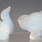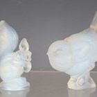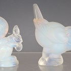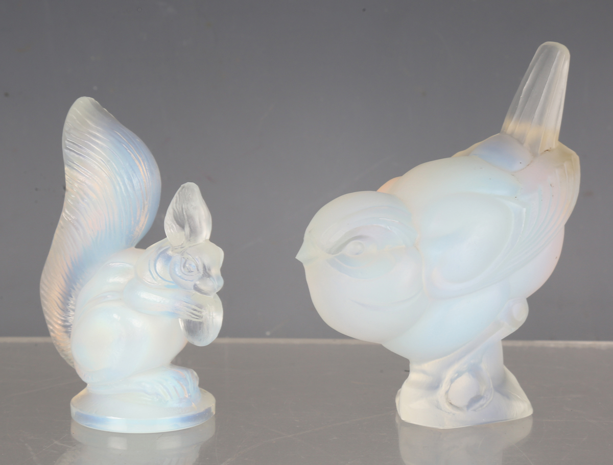 Two Sabino opalescent glass animal models, 1930s, comprising a squirrel on a circular base, moulded mark to tail, height 8cm, and a bird on a shaped base, engraved mark to base, height 9cm.