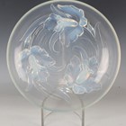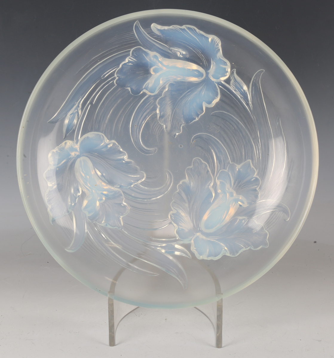 An Art Deco Verlys opalescent glass circular dish, 1930s, moulded to the underside with iris flowers, unmarked, diameter 34.8cm.