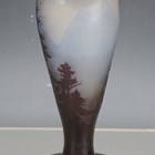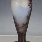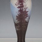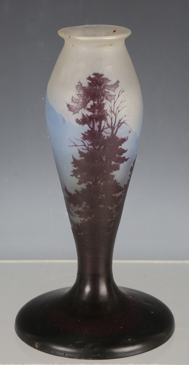A Gallé cameo glass vase, early 20th century, the frosted teardrop shaped body on a large spreading circular foot, overlaid with pale blue and purple and carved with trees before a mountainous riverside landscape, carved mark, height 23cm (minor faults).