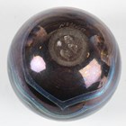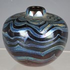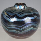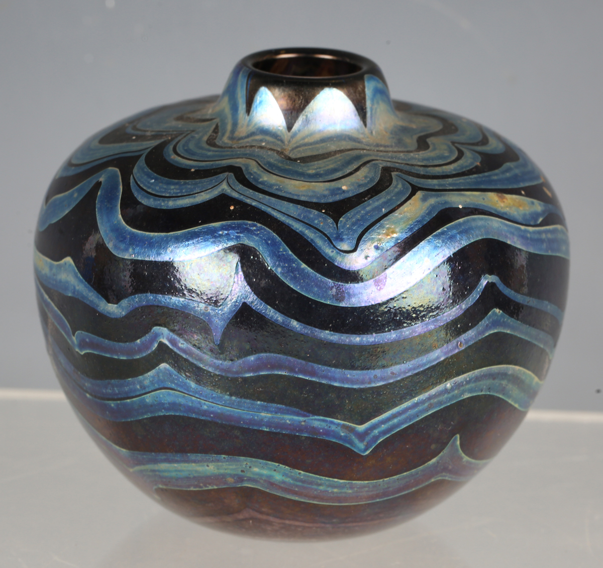 A Norman Stuart Clarke iridescent glass vase, dated 1987, with silvery blue horizontal wavy lines against a dark amethyst ground, engraved marks to base, height 9cm.