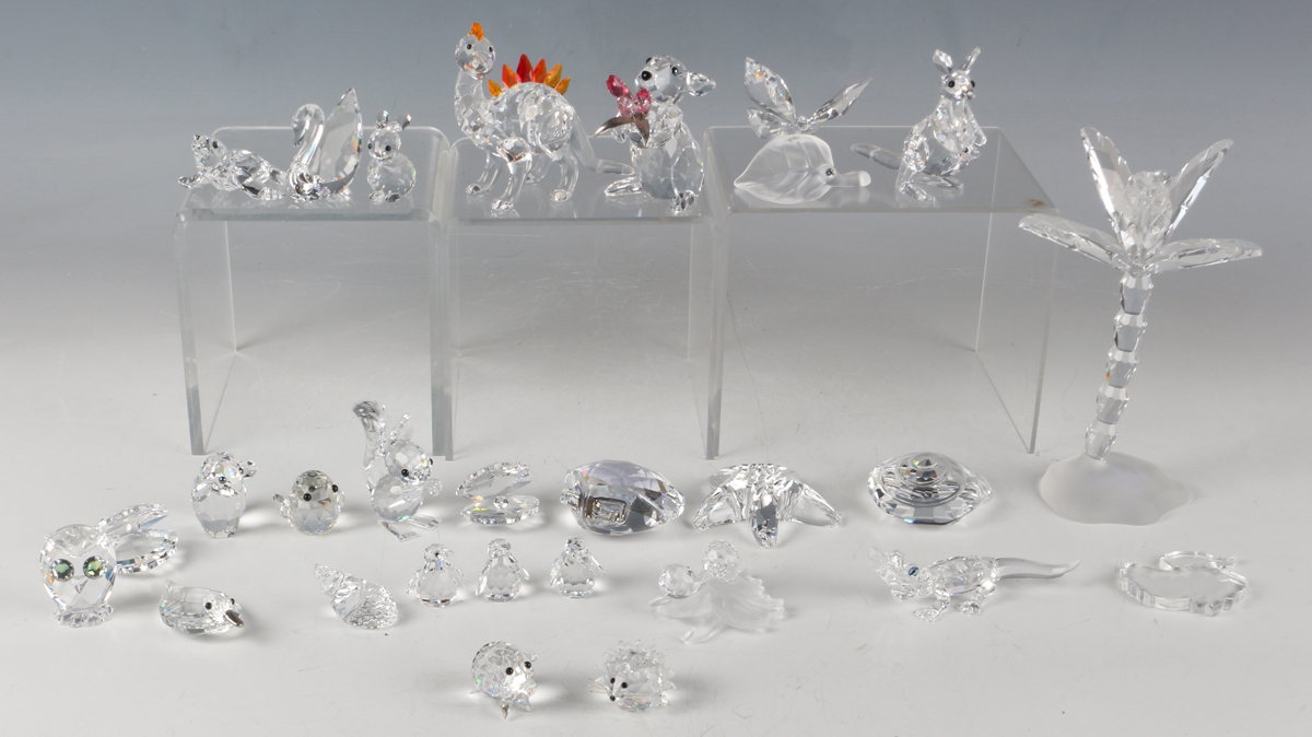 A mixed group of twenty-six Swarovski Crystal ornaments, including Dino the Dinosaur from the Fairy Tales Collection, a Palm Tree from the In The Secret Garden Collection, a rabbit holding a bunch of tulips, a kangaroo with joey from the Rare Encounters group, three baby penguins with Antarctic shaped plastic base and an alligator, with twenty-three original boxes (minor faults).