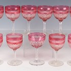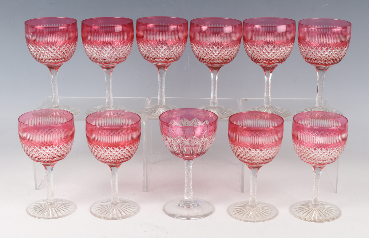 A set of ten cranberry flashed and clear cut wine glasses, early 20th century, with notched hexagonal stems and star cut feet, height 12.5cm, together with a similar glass.