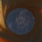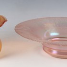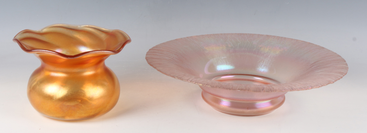 A Thomas Webb Iris Glass posy bowl, late 19th century, of wrythen moulded bulbous shape with amber coloured iridescent surface, acid etched mark to base, height 11.8cm, together with a pale pink iridized circular glass dish, possibly WMF, with cracked ice type rim, diameter 31.5cm.