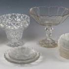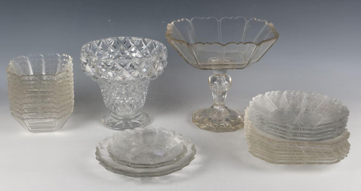 A part suite of cut glass tableware, probably Continental, early 20th century, with radial line detail and scalloped rims, comprising a square shaped centrepiece bowl raised on a baluster stem, height 21cm, eight square plates, length 19cm, five circular plates, diameter 19cm, and ten square shaped deep bowls, length 13.5cm, together with four matched circular glass plates and an Edinburgh Crystal cut glass footed vase, height 17cm (minor faults).