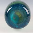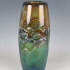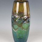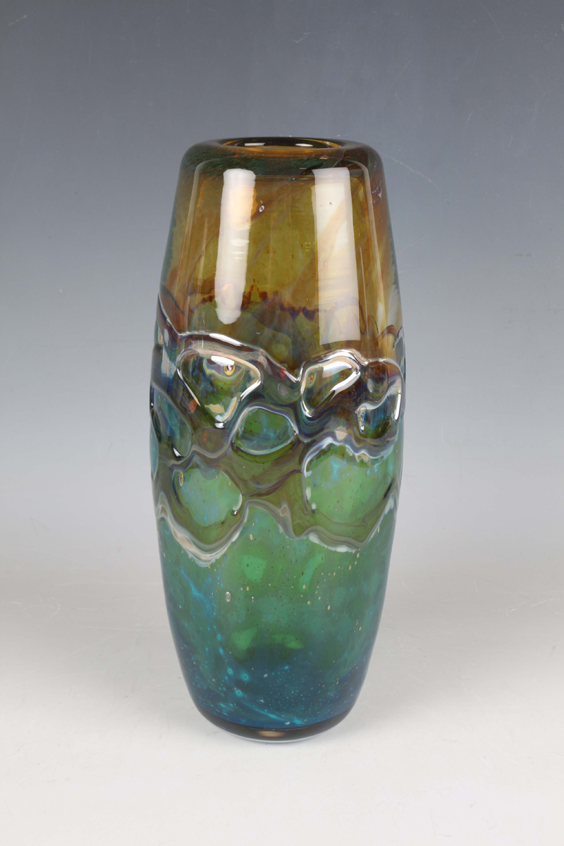 A Whitefriars Peacock Studio Range vase, 1969-70, designed by Peter Wheeler, decorated with random strapping against a kingfisher blue and twilight body, shape No. 6, height 26cm.