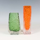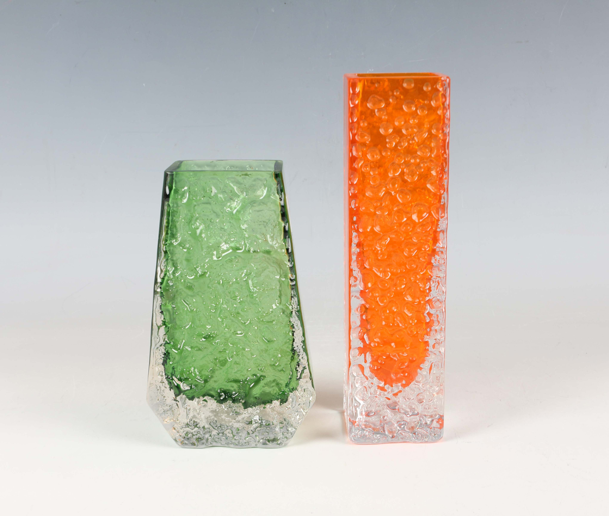 Two Whitefriars Textured Range vases, designed by Geoffrey Baxter, the first of Coffin shape in meadow green, shape No. 9686, height 13cm, the second a Nailhead example in tangerine tint, height 17cm.