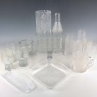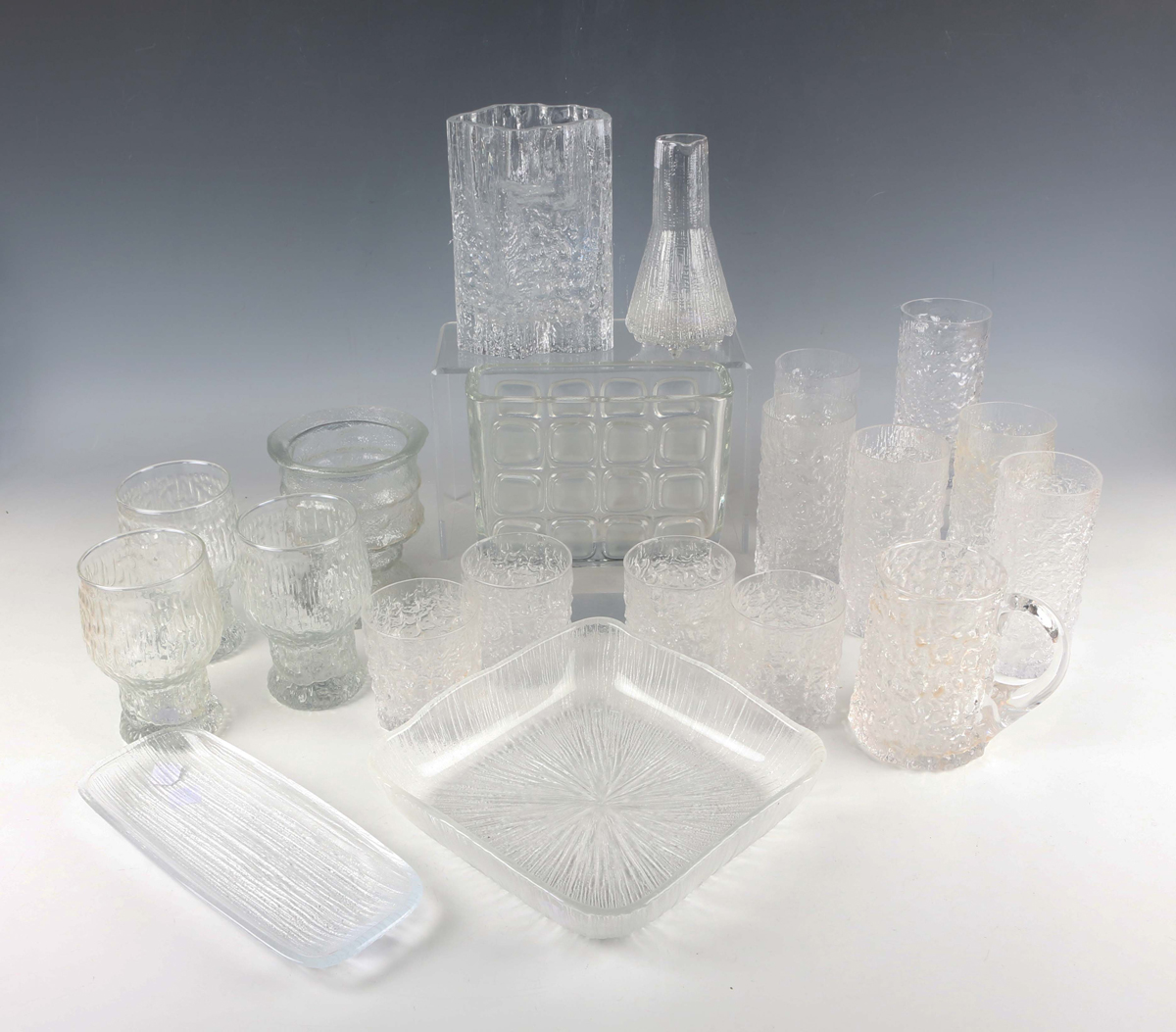 An Iittala clear flint Iceberg vase, designed by Tapio Wirkkala, unmarked, height 16.5cm, together with a Sklo Union Frosted Lens vase of rectangular shape, height 12.8cm, an Iittala Ultima Thule small carafe, height 15cm, and a small group of other similar glassware, including a set of six Whitefriars Glacier hi ball glasses and four matching tumblers.