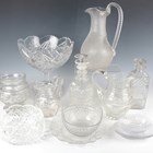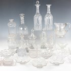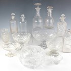 A large mixed group of cut glass tablewares, 18th, 19th and 20th century, including a frosted jug with ice compartment and twisted handle, height 31.5cm, fourteen decanters and some stoppers, including a Georgian example with engraved 'BRANDY' label, four boat shaped oval footed bowls, three similar salts with lemon squeezer bases, an Irish style circular bowl with upright fan handles, diameter 15.5cm, a similar plate with fan and trellis cut rim, diameter 22cm, and a large centrepiece bowl raised on a separate foot (some faults and repairs).