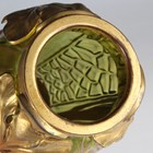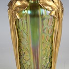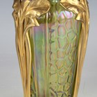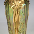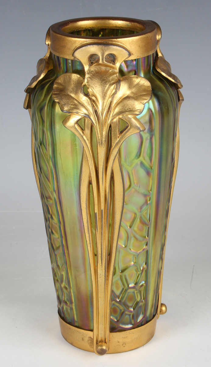 An unusual gilt metal mounted Kralik iridescent glass vase, early 20th century, the tapered green/yellow body with moulded textured surface, mounted with three vertical stylized iris flowers between the mounted rim and foot, glass unmarked, impressed mark to underside of mounted foot, height 21.5cm.
