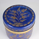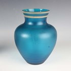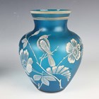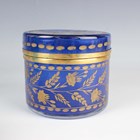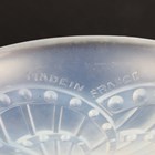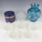 A set of six Art Deco Cristalleries De Sevres opalescent moulded glass single-handled dishes, circa 1930, designed by J. Landier, each with an abstract arched pattern, moulded mark 'FRANCE' to underside rim edges, diameter excluding handles 11.3cm, together with a cylindrical blue glass jar and cover engraved and gilt with flowers, height 10cm, and a blue glass vase enamelled in white with a bird amidst flowers and foliage, height 19.5cm.