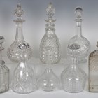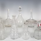 A pair of engraved and cut glass water carafes, 19th century, the bulbous bodies engraved with a band of fruiting vine between geometric banding beneath the notch cut hexagonal necks, star cut bases, height 21cm, two decanters and one stopper engraved with ferns, a Webb Corbett cut glass decanter and stopper with lobed base, height 25cm, a decanter with engraved 'BRANDY' inscription, a pair of vertical cut decanters and stoppers and a collection of other mostly cut glass decanters and some stoppers (minor faults). Provenance: from the collection of John and Poppy Stallebrass.