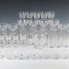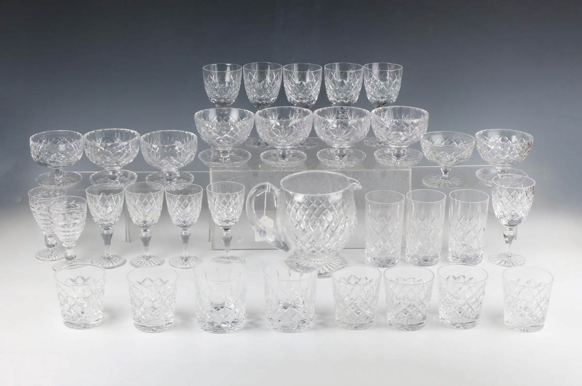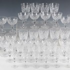 A part suite of Thomas Webb glasses, cut with a diamond pattern above baluster stems and star cut feet, including nine large wine, height 16cm, eight smaller wine, height 14.5cm, twenty-four champagne saucers, height 11.5cm, six port, six sherry, six tumblers and a water jug, height 15cm, together with a small group of other similar glasses.