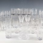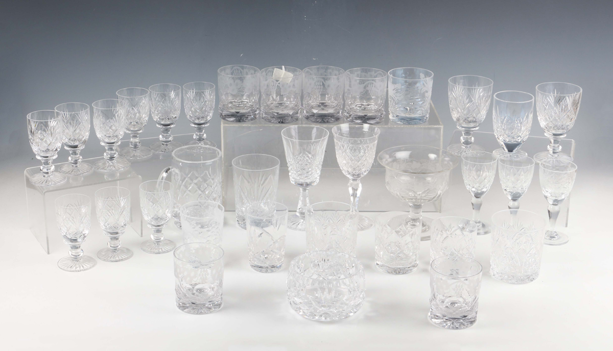 A set of six Tudor glass tumblers, each engraved with fruiting vine above cut detail, star cut bases, height 7.7cm, together with a small group of other drinking glasses, including a Waterford wine, height 15.2cm, a Waterford footed tumbler, height 10cm, nine Tudor port glasses, height 10cm, other examples by Tudor and some Royal Brierley.
