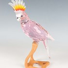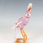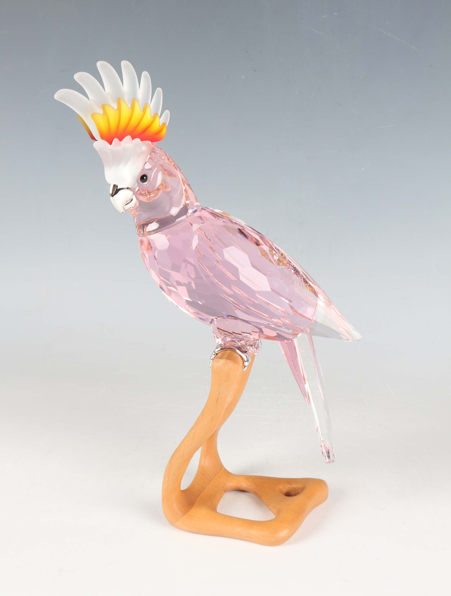 A Swarovski Crystal Red Cockatoo from the Birds of Paradise series, designed by Roland Schuster, circa 2010, of pink tint perched on a wooden base, height 24cm, boxed.