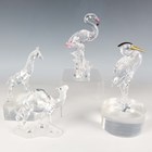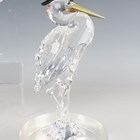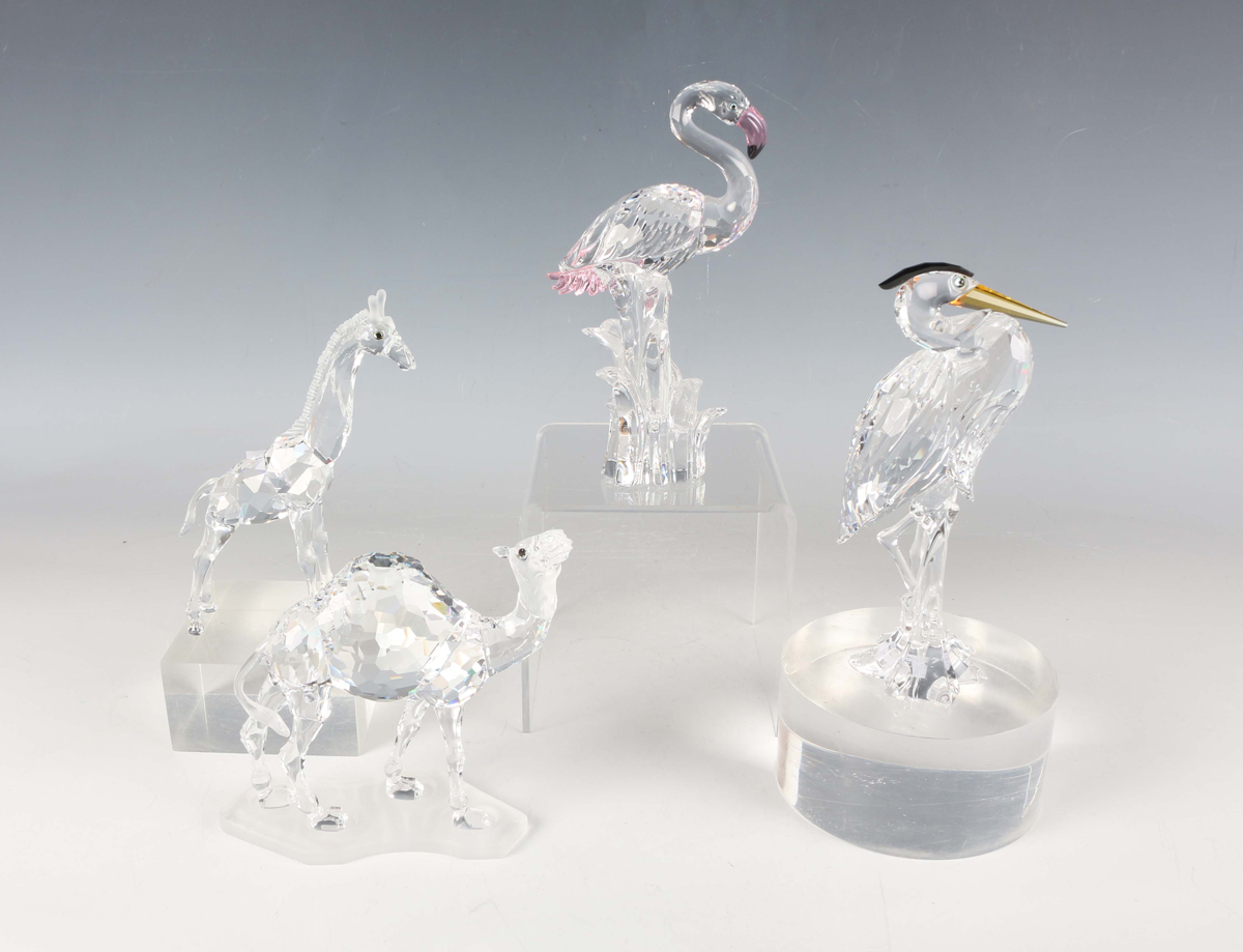 A Swarovski Crystal Feathered Beauties Collection flamingo, designed by Gabriele Stamey, height 15.2cm, together with a Swarovski Crystal Feathered Friends heron, designed by Adi Stocker, height 15cm, and a camel and a baby giraffe from the African Wildlife group, each boxed.