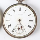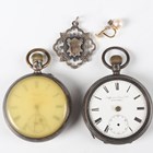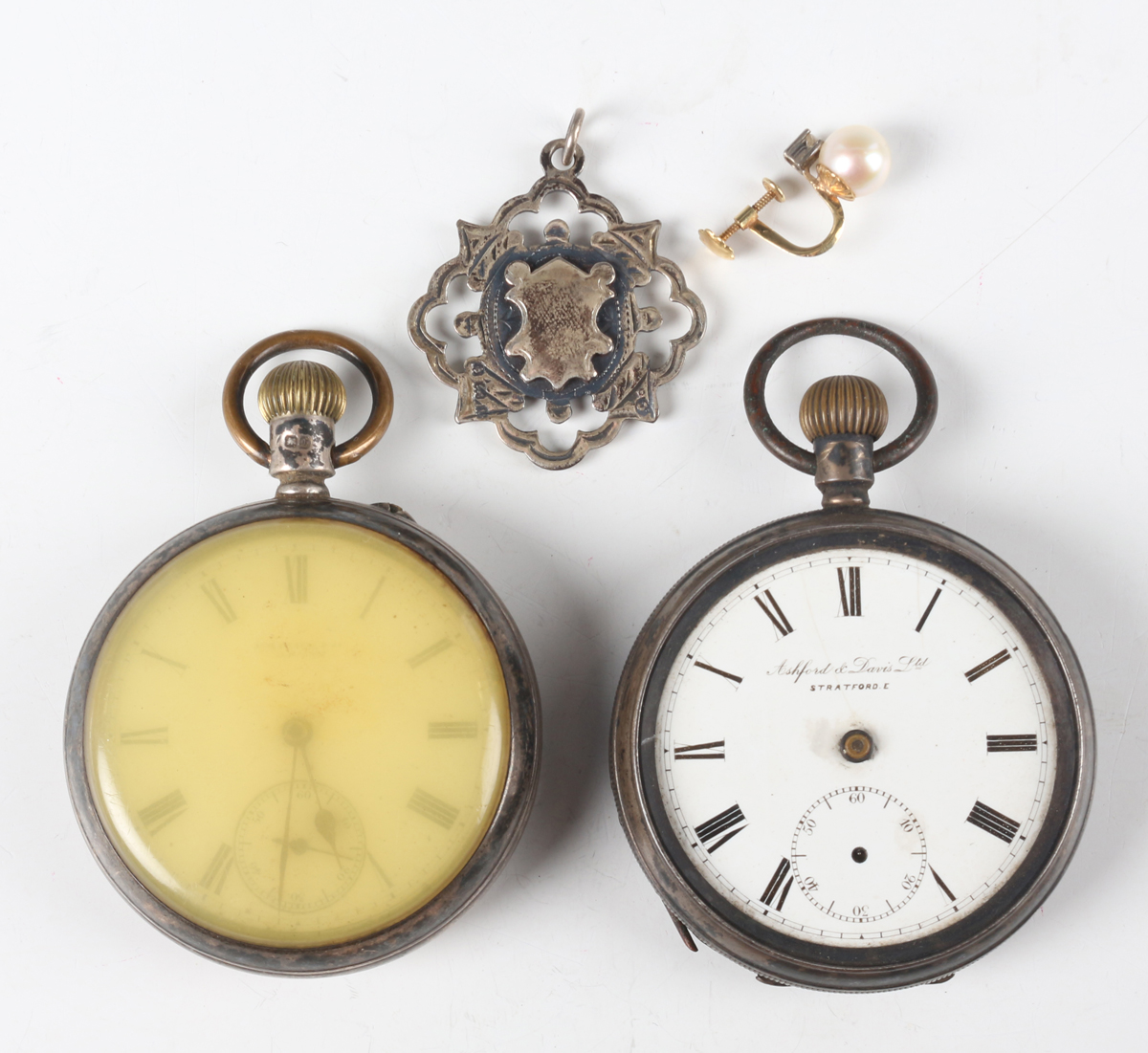 A late Victorian silver cased keyless wind open-faced gentleman's pocket watch, the jewelled gilt lever movement detailed 'Johnston & Co... Glasgow', the similarly signed enamelled dial with subsidiary seconds, Chester 1899, case diameter 4.8cm, together with a similar silver gentleman's pocket watch, case diameter 4.8cm, a gold, cultured pearl and diamond earstud with screw fitting, detailed '14ct', and a silver fob medallion.