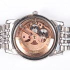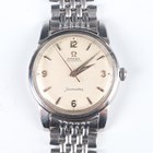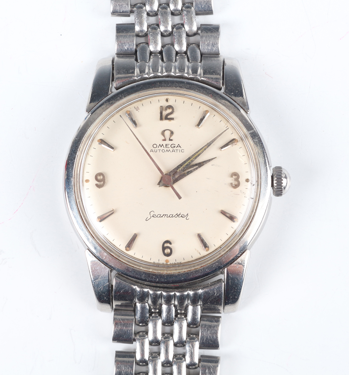 An Omega Automatic Seamaster stainless steel gentleman's bracelet wristwatch, Ref. 14761 1 SC, circa 1961, the signed and jewelled 552 caliber movement numbered '18266570', the signed silvered dial with Arabic numeral and arrowhead hour markers, the case back with Seamaster emblem, the signed case back interior detailed '14761 1 SC', the tapered link bracelet with signed foldover clasp, case diameter 3.4cm, with red Omega case.