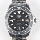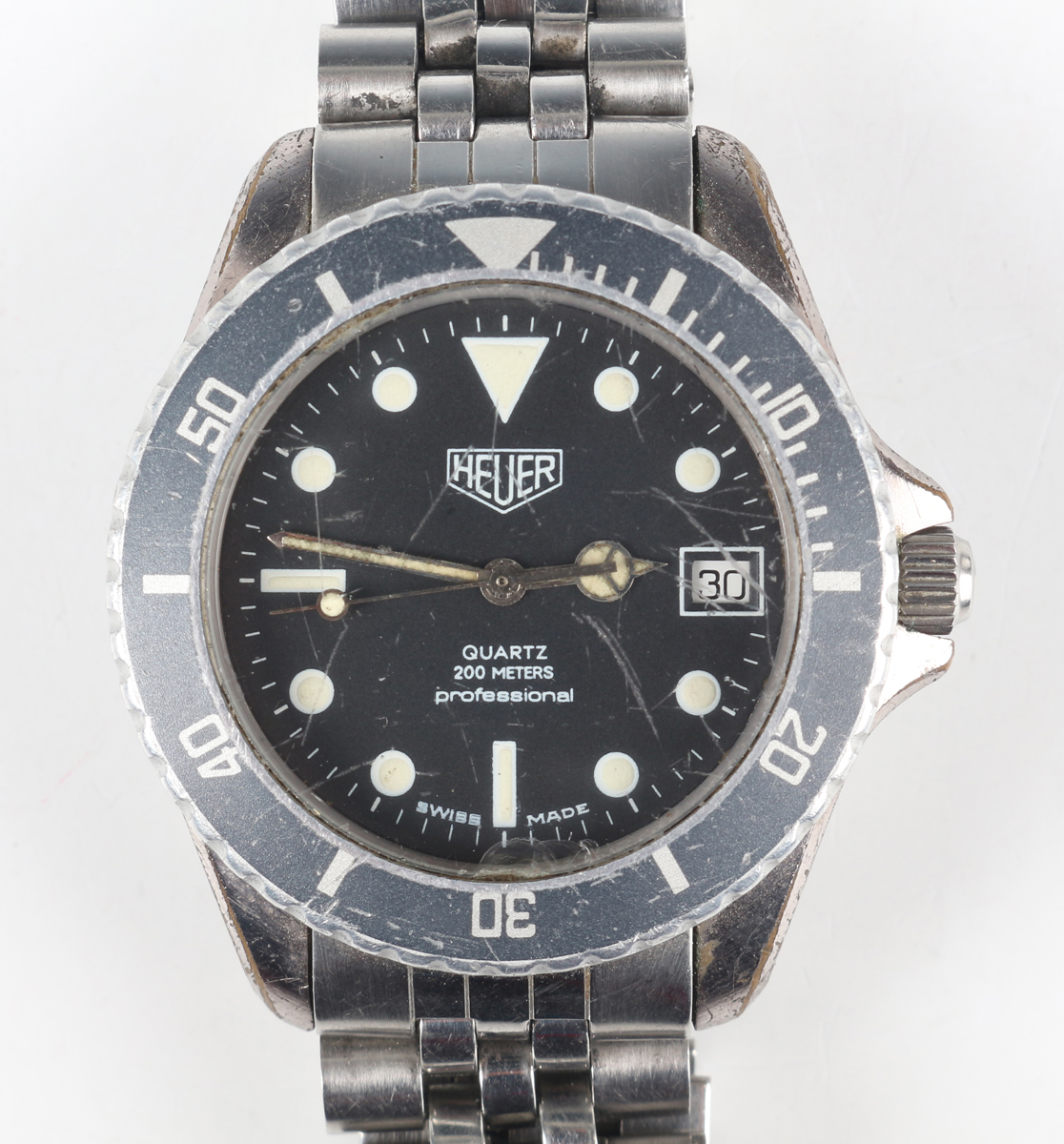 A Heuer Quartz 200 Meters Professional stainless steel gentleman's bracelet wristwatch, Ref. 980.033, with quartz movement, the signed black dial with luminous hour markers and date aperture, the case back interior detailed 'Heuer-Leonidas SA' above '1272.001' and '7236 W 20', the case back numbered '980.033', the case with rotating bezel, on a tapered link bracelet with foldover clasp, case width 4cm.
