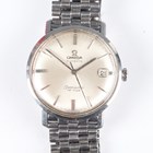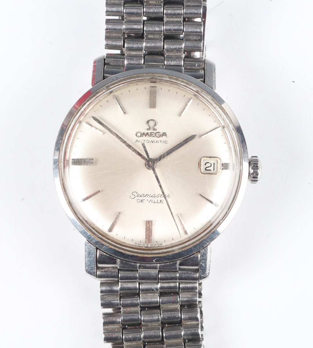 An Omega Automatic Seamaster De Ville stainless steel gentleman's bracelet wristwatch, Ref. 14910 SC 62, circa 1963, the signed and jewelled 562 caliber movement numbered '20715361', the signed silvered dial with baton hour markers and date aperture, the signed case back interior numbered '14910 SC-62', the case back with embossed Seamaster emblem, the link bracelet with signed foldover clasp, case diameter 3.5cm, with red Omega case and outer card box, J.W. Benson watch warranty/receipt and Omega international guarantee booklet, dated '20-5-64'.