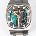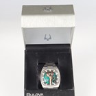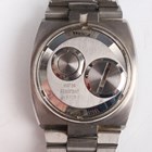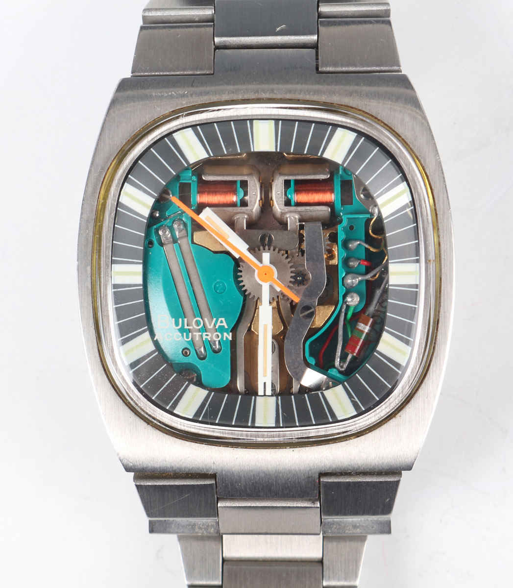 A Bulova Accutron Spaceview stainless steel gentleman's bracelet wristwatch with signed skeletonized dial, the case back numbered '483083', the tapered link bracelet with signed foldover clasp, case width 3.7cm, with case.