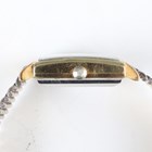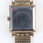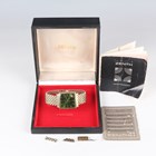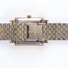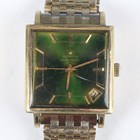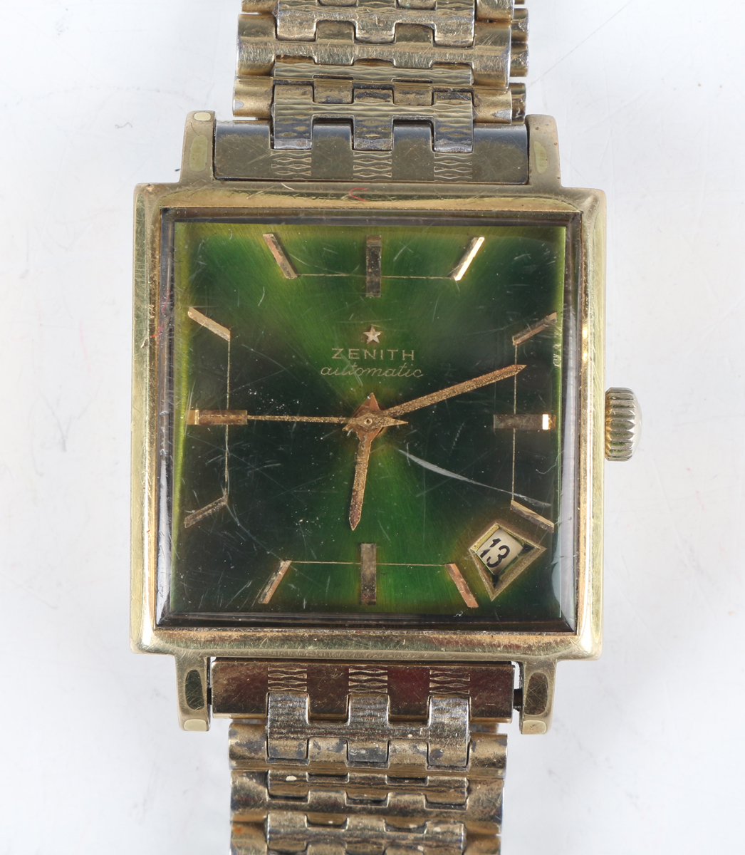 A Zenith Automatic gilt metal and steel backed square cased gentleman's bracelet wristwatch, circa 1970s, the signed green dial with gilt baton hour markers and date aperture to lower right corner, the link bracelet with signed foldover clasp, case width 3cm, with Zenith case, spare links, instruction booklet and international guarantee certificate, dated '29/1/76'.