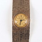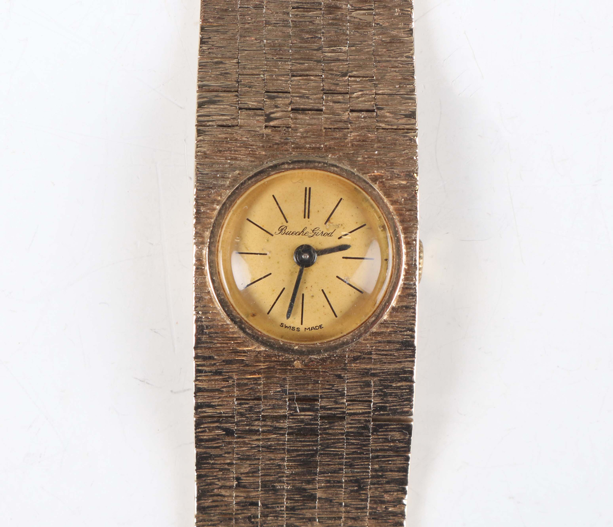 A Bueche-Girod 9ct gold lady's bracelet wristwatch with jewelled manual wind movement, the signed gilt dial with baton hour markers, the textured link bracelet with sliding clasp, London 1968, total weight 34.2g, total length 16cm.