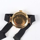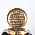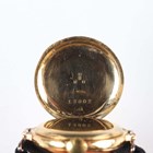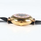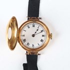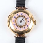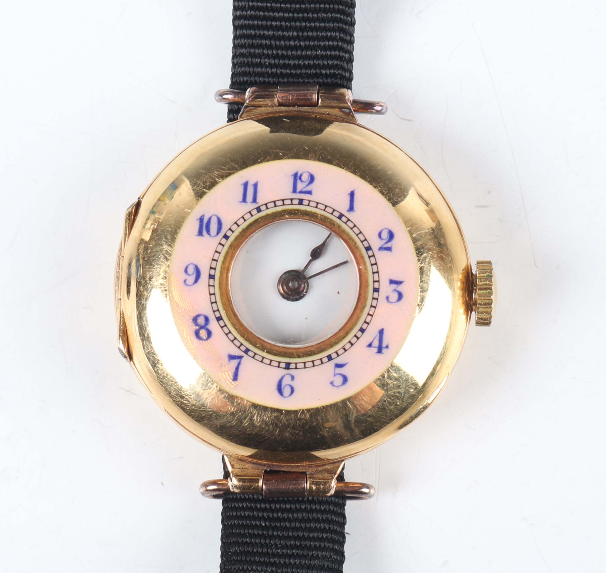 An 18ct gold and enamelled circular half-hunting cased lady's wristwatch with unsigned jewelled movement, the white enamelled dial with black Roman hour numerals, the hinged case front with apricot enamelled chapter ring and blue Arabic hour numerals, with gold inner case, import mark London 1913, case diameter 2.6cm, on a black silk bracelet, total weight 18.9g.