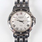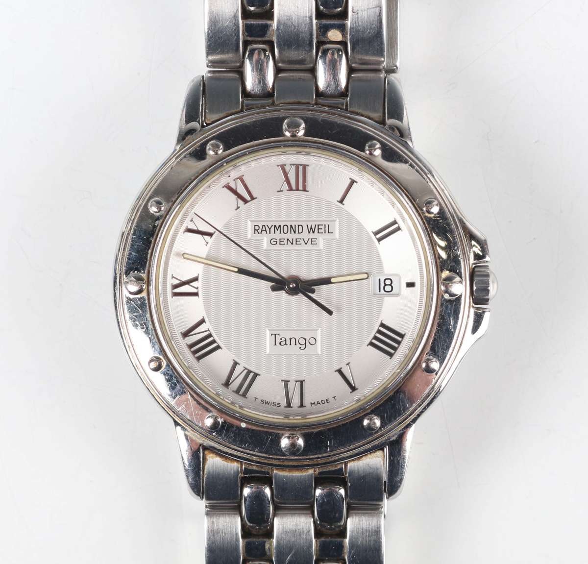 A Raymond Weil Genève 'Tango' stainless steel circular cased gentleman's bracelet wristwatch with quartz movement, the signed silvered dial with Roman hour numerals and date aperture, the case back detailed '5560' over 'Z 562039', the link bracelet with concealed twin folding clasp, case width 3.7cm.
