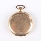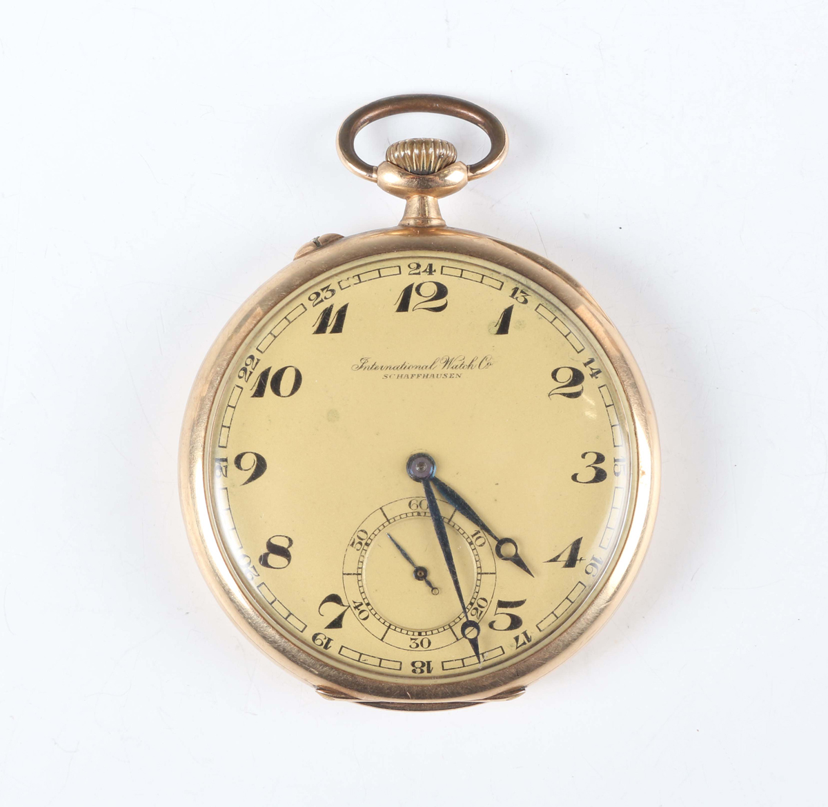 An International Watch Co (IWC) 14K gold circular cased keyless wind open-faced gentleman's pocket watch with signed and jewelled movement, the signed gilt dial with black Arabic hour numerals and subsidiary seconds, the case back interior detailed '14K 0,585' and numbered '813443', with gilt metal inner case, total weight 78.2g, case diameter 4.9cm.