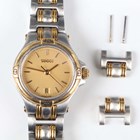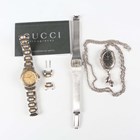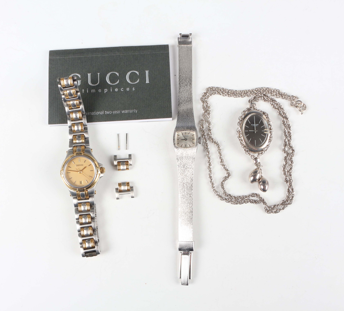 A Gucci steel and gilt metal lady’s bracelet wristwatch, case width 2.7cm, with spare links, original international two year warranty, detailed ‘8-12-99’, and further paperwork, together with a Pallas Para lady’s bracelet wristwatch and a Pallas Para lady’s pendant necklace watch.