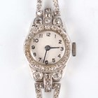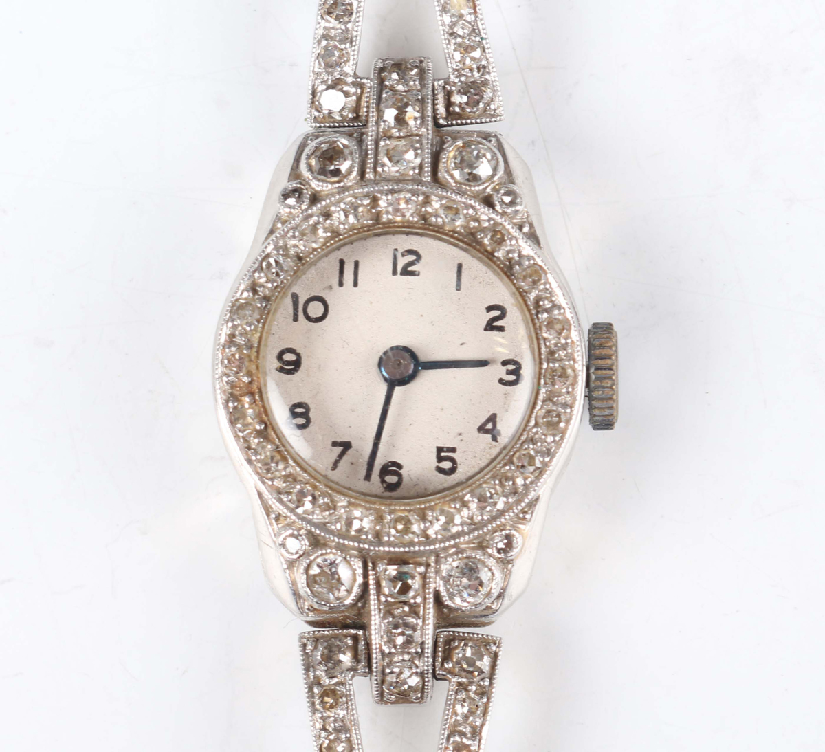 A platinum and diamond set circular cased lady's dress wristwatch with jewelled manual wind movement, the unsigned silvered dial with black Arabic hour numerals, the case surround and bracelet mounts set with circular cut diamonds, the case unmarked, case width 1.7cm, on a cord strap.