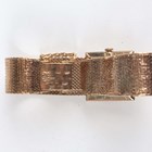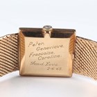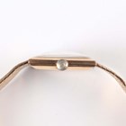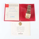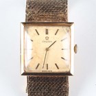 An Omega 9ct gold square cased bracelet wristwatch, Ref. 3115490, with signed and jewelled 620 caliber manual wind movement, the signed gilt dial with baton hour markers, the case back presentation engraved, the woven mesh tapering bracelet with signed foldover clasp, London 1967, total weight 52.3g, case width 2.5cm, total length 19cm, with red Omega wallet and paperwork.