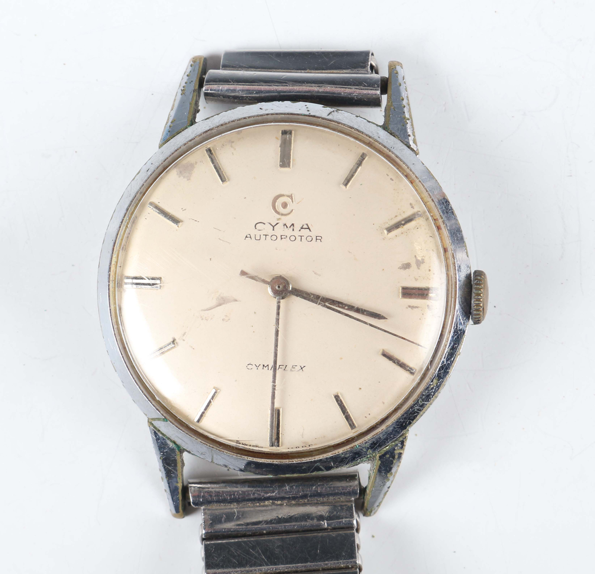 A Cyma Autorotor Cymaflex stainless steel backed circular cased gentleman's wristwatch, the signed and jewelled R.480 caliber automatic movement numbered '172638', the signed silvered dial with baton hour markers, the signed case back interior detailed '1.51701.6' over '1701', case diameter 3.4cm, on an expanding bracelet.
