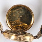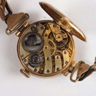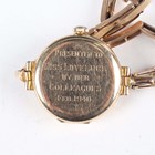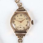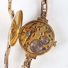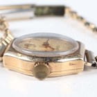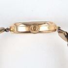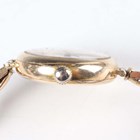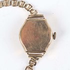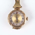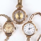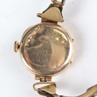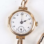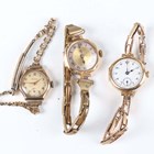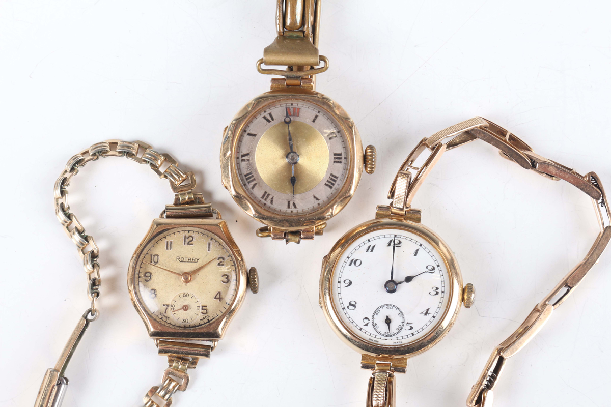 A 9ct gold circular cased lady's bracelet wristwatch, the white enamelled circular dial with black Arabic hour numerals, the sprung link bracelet detailed '9ct', case diameter 2.5cm, total weight 18g, together with two other 9ct gold lady's wristwatches with gilt metal bracelets.