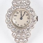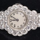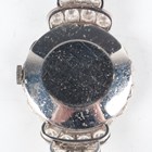 A Rolex platinum and diamond set lady's cocktail wristwatch with signed and jewelled Superbalance manual wind movement, the unsigned silvered dial with black Arabic hour numerals, the circular bezel surround and stepped bracelet mounts mounted with circular cut diamonds, the platinum cord bracelet with foldover clasp, detailed 'Plat', total weight 28g, case diameter 2.5cm, total length 18.5cm, with fitted gilt tooled blue leather case.