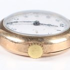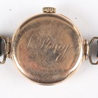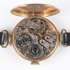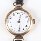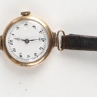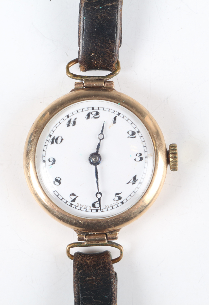 A Buren 9ct gold circular cased lady's wristwatch with signed and jewelled manual wind movement, the white enamelled dial with black Arabic hour numerals, Birmingham 1931, case diameter 2.5cm, on a black leather strap, total weight 17.6g.