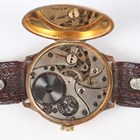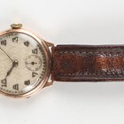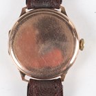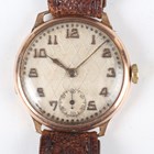 A 9ct gold circular cased gentleman's wristwatch with unsigned jewelled manual wind movement, the unsigned silvered dial with checkered diamond pattern, gilt Arabic hour numerals and subsidiary seconds, London 1931, case diameter 3cm, on a brown leather strap.