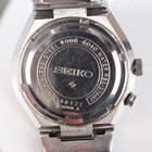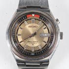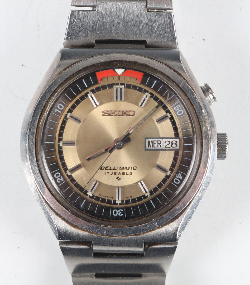 A Seiko Bell-Matic stainless steel gentleman's bracelet wristwatch, Ref. 4006-6040, circa August 1973, with signed and jewelled 4006A caliber automatic movement, the signed champagne tinted dial with baton hour markers, day and date aperture and rotating bezel with alarm indicator, the signed case back detailed '4006-6040' and numbered '380122', the tapered link bracelet with signed foldover clasp, case diameter 3.9cm.