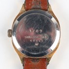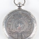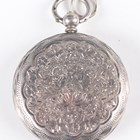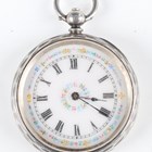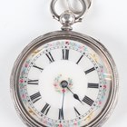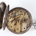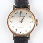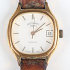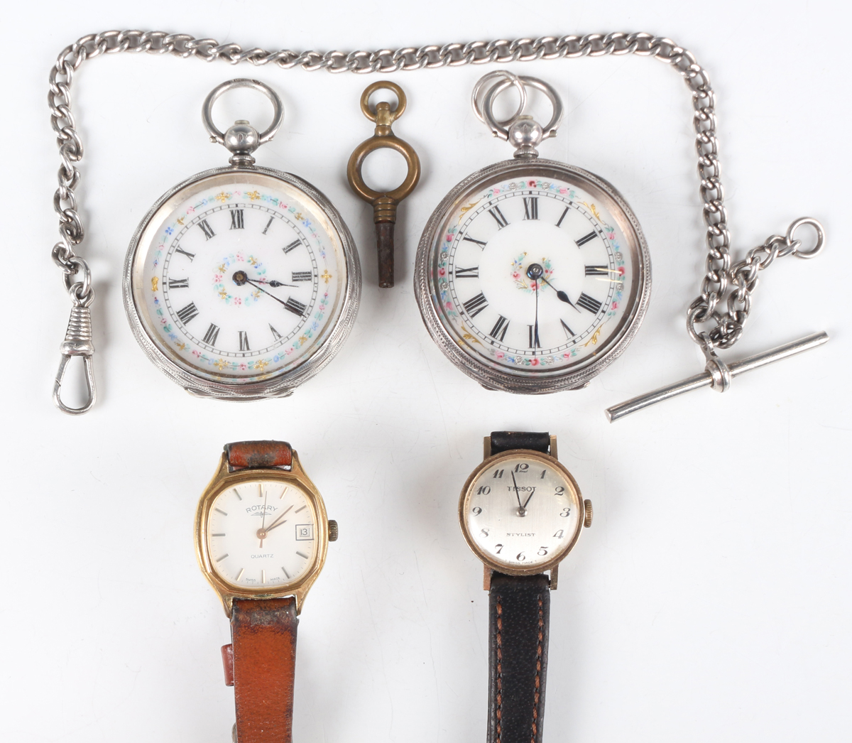 A Tissot Stylist 9ct gold circular cased lady's wristwatch, the signed silvered dial with black Arabic hour numerals, case diameter 2.1cm, together with a Rotary Quartz gilt metal fronted lady's wristwatch, two silver fob watches, a watch chain and a winding key.