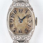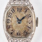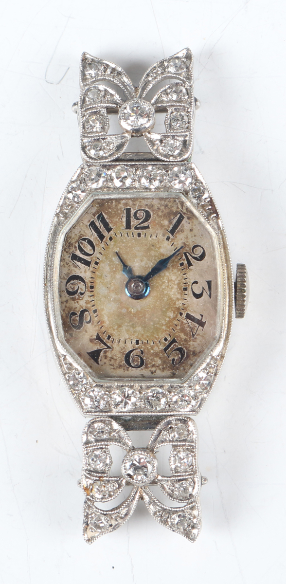 A platinum and diamond set lady's dress wristwatch, the jewelled manual wind movement detailed 'Sorority Watch Co', the unsigned silvered dial with black Arabic hour numerals, the case and bracelet mounts set with circular cut diamonds, the case interior detailed 'Platinum', total weight 11.3g, case width 1.5cm, length 4.1cm (bracelet lacking).