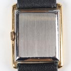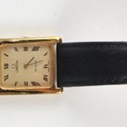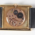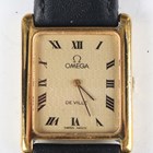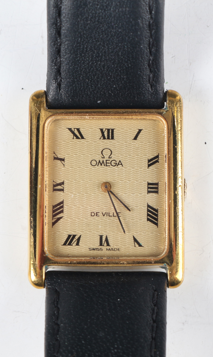 An Omega De Ville gilt metal fronted and steel backed rectangular cased gentleman's wristwatch, Ref. 5110404, with jewelled manual wind movement, the signed gilt dial with black Roman hour numerals, the signed case back interior numbered '5110404', case width 2.4cm, on a black leather strap.