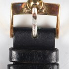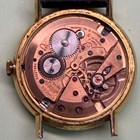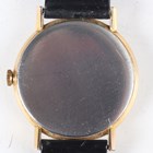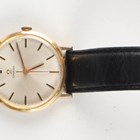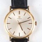 An Omega gilt metal fronted and steel backed circular cased gentleman's wristwatch with signed and jewelled manual wind movement, the signed silvered dial with gilt baton hour markers, case diameter 3.4cm, on a brown leather strap with Omega buckle.