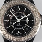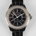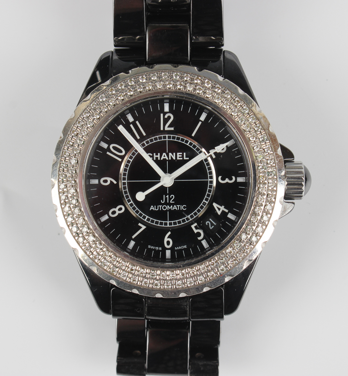 A Chanel J12 Automatic black ceramic and diamond set gentleman's bracelet wristwatch, Ref. No. N.M 53455, with signed and jewelled movement, the signed black dial with white Arabic hour numerals, centre seconds and date aperture, the case with diamond set bezel, the black ceramic link bracelet with concealed folding clasp, case diameter 3.9cm, boxed with international guarantee booklet and card.