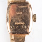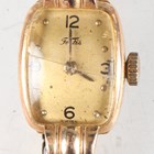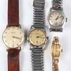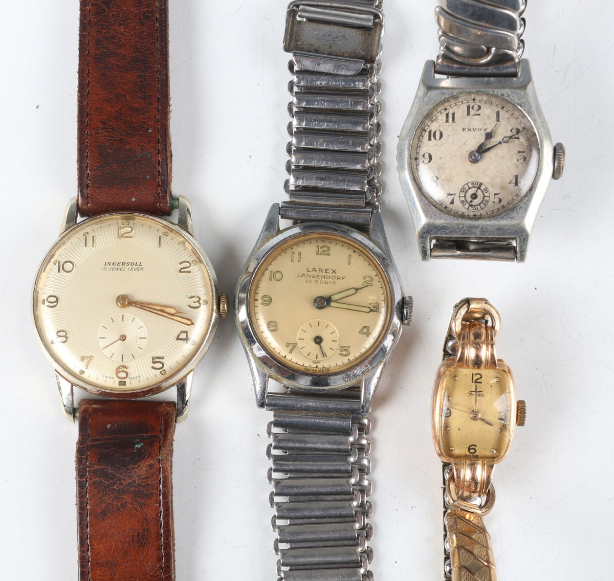 A Fortis 18ct gold cased lady's wristwatch, the signed gilt dial with Arabic numeral and dot hour markers, import mark London 1955, case width 1.4cm, on a gilt metal fronted expanding bracelet, total weight 18.8g, together with an Ingersoll steel backed gentleman's wristwatch, a Larex steel backed mid-size wristwatch and an Envoy mid-size wristwatch.