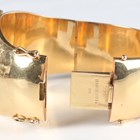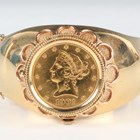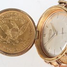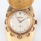 A Nicolet two-colour gold hinged bangle wristwatch, the front with hinged cover mounted with a USA ten dollars 1901, opening to reveal a silvered dial with baton hour markers, subsidiary seconds and detailed 'Nicolet Watch', the snap clasp with two safety catches and detailed 'Handarbeit 750' to tongue, total weight 161g, inside width 5.7cm, width of front 3.9cm.