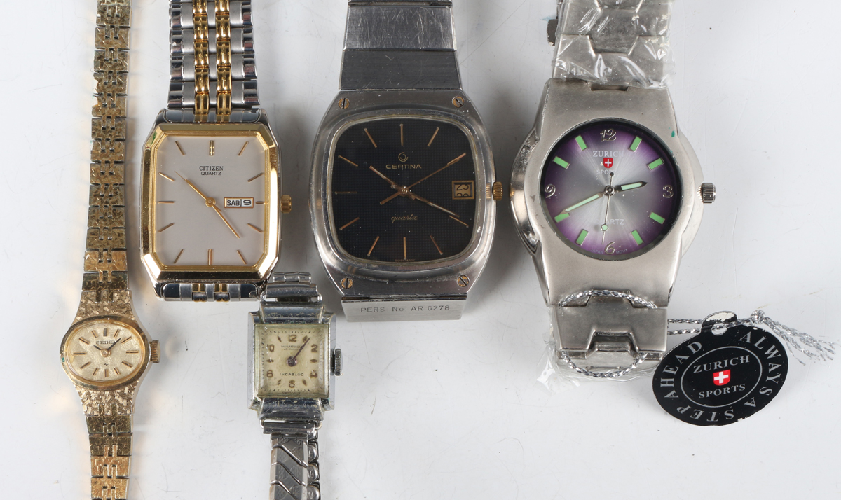 A Certina Quartz stainless steel gentleman's bracelet wristwatch, case width 3.5cm, together with two other gentlemen's quartz bracelet wristwatches by Citizen and Zurich, and two ladies' wristwatches by Seiko and Winegartens.