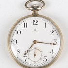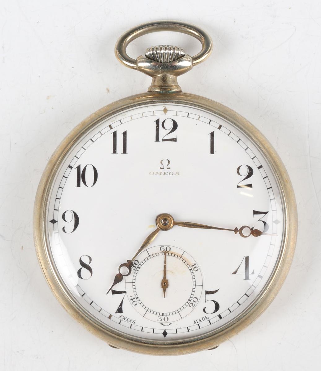 An Omega base metal cased keyless wind open faced gentleman's pocket watch, circa 1944, the signed and jewelled movement numbered '10718044', the signed white enamelled dial with black Arabic hour numerals and subsidiary seconds, case diameter 4.7cm, with a later case.